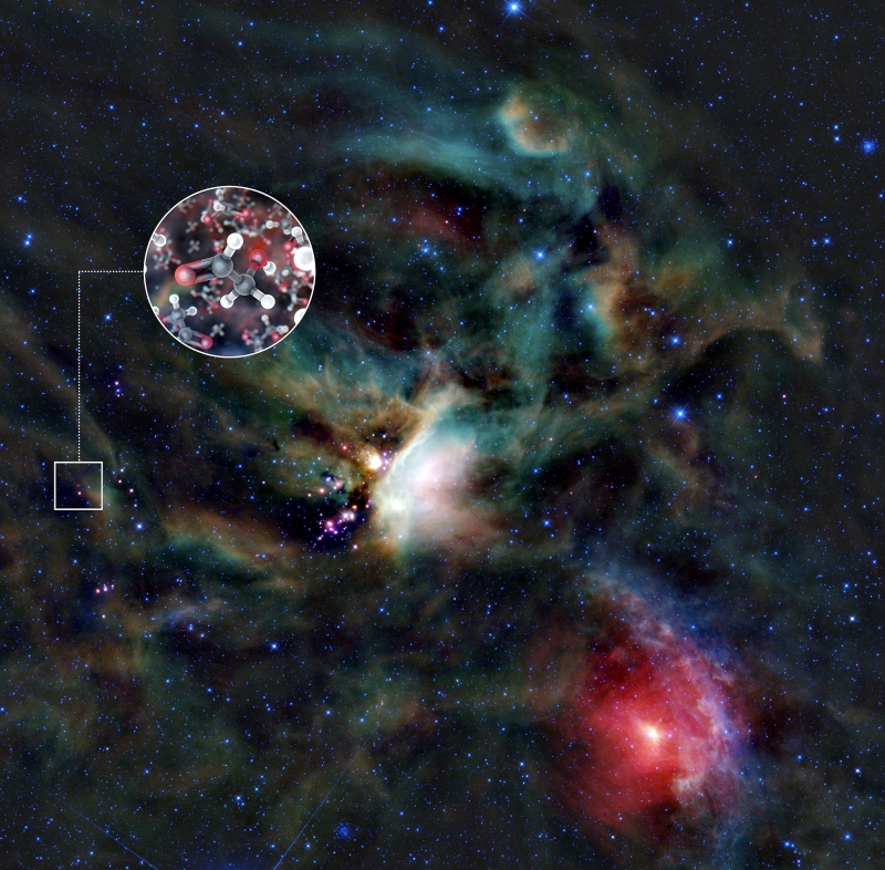 Imagem captada pelo radiotelescópio Alma, instalado no deserto de Atacama, no Chile, mostra a zona de formação da estrela Iras 16293-2422, que teria moléculas de açúcar ao seu redor. Essa foi a primeira vez que a equipe de astrônomos do Observatório Austral Europeu detectou açúcar em torno de uma estrela. No detalhe, uma reprodução artística da estrutura molecular do glicoaldeído existente no gás da estrela. A Iras possui massa similar à do Sol e está localizada a 400 anos-luz da Terra. Segundo o astrônomo Jes Jorgensen, do Instituto Niels Bohr, da Dinamarca, e principal autor do estudo, "essa molécula é um dos ingredientes na formação do ácido ribonucleico (RNA), que, assim como o DNA, é um dos ingredientes fundamentais para a vida".