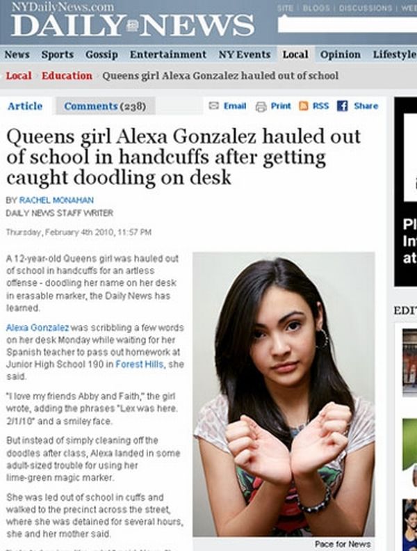 Os advogados de Alexa Gonzalez consideram que a polícia usou de abuso de poder e violou os direitos da adolescente durante o incidente, que aconteceu em fevereiro em um colégio do bairro de Queens, informa o jornal Daily News neste domingo (4).