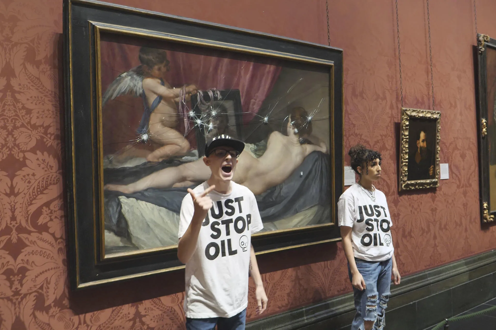 Dois ambientalistas do grupo Just Stop Oil foram presos nesta segunda-feira (6) depois de quebrarem o vidro que cobria uma pintura de Diego Velázquez na National Gallery, em Londres, informou a Polícia Metropolitana londrina (Met).
