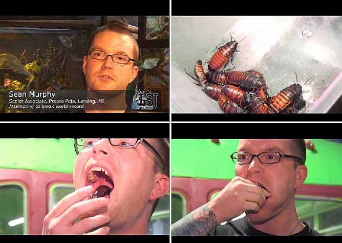 O americano Sean Murphy afirma ter batido o recorde mundial ao colocar 16 baratas na boca.