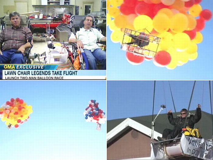 Kent Couch e John Freis percorreram 112 quilômetros a uma altura de 5,4 mil metros. Os homens também estavam com paraquedas caso precisassem interromper a aventura. Para que cada espreguiçadeira pudesse voar, foram utilizados mais de 100 balões de festa.