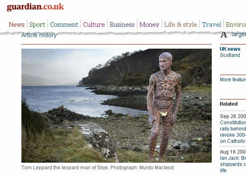 Tom Leppard, de 73 anos, conhecido como o "Homem-leopardo", deixou a vida selvagem e se mudou para uma casa na cidade de Broadford, na Escócia. Em entrevista ao "The Guardian" nesta terça (28), ele diz que estava começando a sentir as conseqüências de morar em uma cabana durante 20 anos.Ele entrou para o Guinness com o título de "homem mais tatuado" ao ter 99,2% de seu corpo coberto com tatuagens que simulam as cores de um leopardo. A cabana em que Tom morava não tinha janelas, nem cama. A nova casa conta com móveis e luz elétrica.