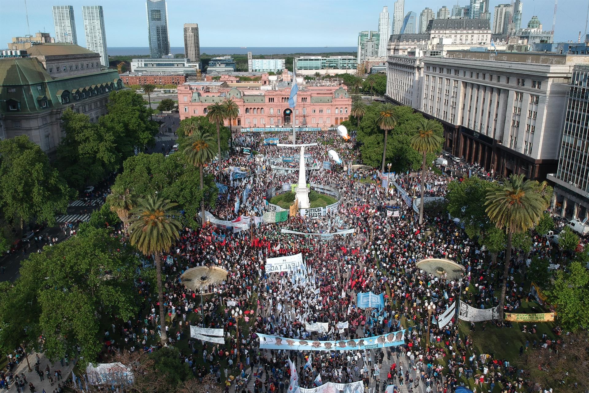 Milhares de argentinos se reuniram para a marcha, em comemoração ao "Dia da Lealdade Peronista", na Plaza de Mayo, em Buenos Aires. No local está um memorial às vítimas da pandemia, formado por pedras em que estão gravados os nomes de pessoas que morreram de Covid-19, além de fotografias das vítimas deixadas por familiares e cartazes com mensagens críticas ao governo de Fernández pela gestão da pandemia.