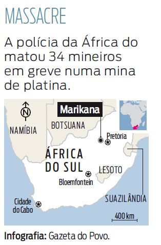 Depois de matar ontem 34 trabalhadores em greve de uma mina de platina, a polícia sul-africana disse que agiu em autodefesa na operação em que abriu fogo contra os funcionários. A ação foi considerada uma das mais violentas contra um protesto no país desde o fim do apartheid (1994).