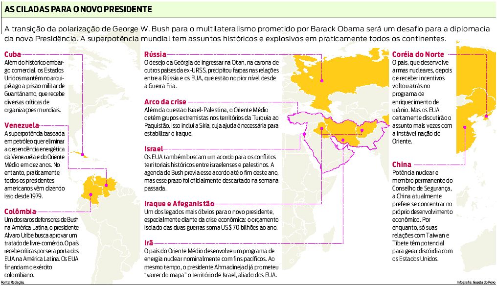 A "nova diplomacia" prometida pelo presidente eleito, portanto, precisa ser abrangente e multidisciplinar. "Não tem como escolher, ele vai ter de enfrentar todos esses desafios ao mesmo tempo. Qualquer líder de uma superpotência não pode se dar ao luxo de dividir os assuntos e lidar com uma coisa de cada vez; de primeiro tentar resolver os conflitos do Oriente Médio para depois voltar a dialogar com os parceiros da América Latina, Ásia e África", avalia o vice-presidente da comissão jurídica da Organização dos Estados Americanos, Ricardo Seitenfus.