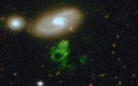 O achado, apelidado de "Hanny's Voorwerp" (objeto de Hanny, em holandês), logo atraiu os telescópios dos cientistas. "O que vimos era realmente um mistério. O Voorwerp não continha nenhuma estrela", diz Schawinski. Feito inteiramente de gás muito quente, o objeto verde e fantasmagórico é iluminado por um resto de luz da galáxia IC 2497, que fica ali perto.