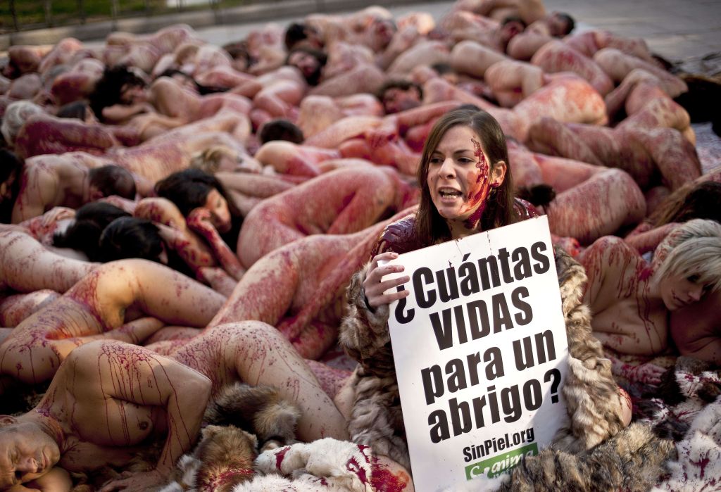 Durante o ato, realizado na Praça da Espanha, os manifestantes pintaram o corpo de vermelho para simular que estavam "ensanguentados" e denunciaram que a cada ano mais de 60 milhões de animais são "brutalmente assassinados" por conta de suas peles, explicou à Agência Efe a diretora da AnimalNaturalis Espanha, Aida Gascon.