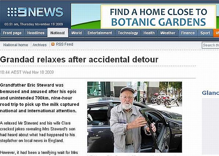 Segundo a emissora australiana "9 News", Eric Steward, de 80 anos, resolveu parar e pedir informações depois de passar nove horas dirigindo sem rumo.