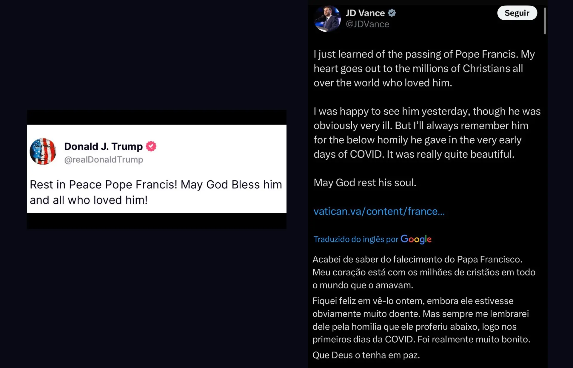 Trump se manifestou por volta das 9 horas na Truth Social, afirmando: "Descanse em paz, papa Francisco! Que Deus o abençoe e a todos que o amaram!". Em uma publicação separada, Vance disse que "seu coração está com milhões de cristãos em todo o mundo que o amavam".