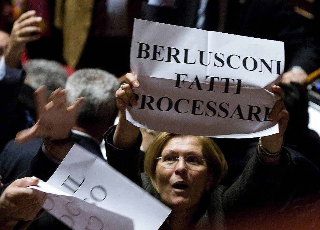 Alguns senadores oposicionistas agitavam cartazes com os dizeres "Berlusconi, enfrente seus julgamentos."