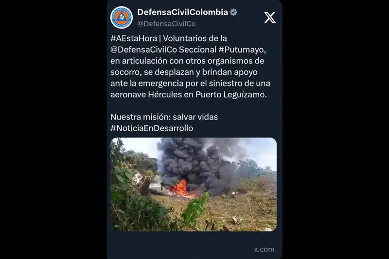 "Com profundo pesar, informo que um avião Hércules da nossa @FuerzaAereaCol sofreu um trágico acidente durante a decolagem de Puerto Leguízamo (Putumayo), enquanto transportava tropas da Força Pública", declarou o ministro nas redes sociais.