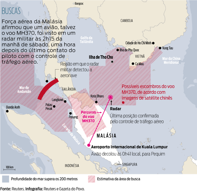 O voo MH370 era operado por um Boeing 777-200 que tinha combustível para 7,5 horas de voo e transportava 239 pessoas de Kuala Lumpur (Malásia) para Pequim, na China.