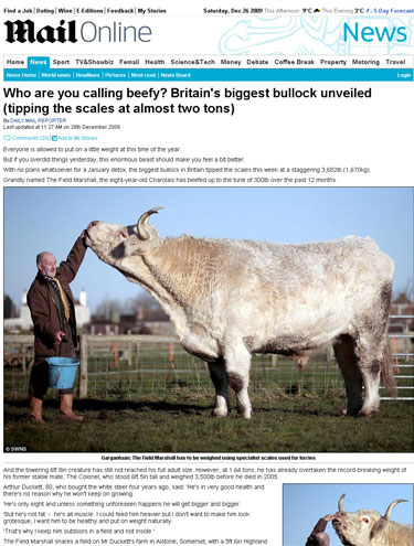 O maior boi da Inglaterra está perto de conquistar um recorde. Após engordar 135 kg em 2009, Field Marshall (em inglês, Marechal-de-campo), 8 anos, atingiu a marca de 1.670 kg. Ele já superou o recorde da fazenda onde vive, que pertencia a um boi morto em 2005.