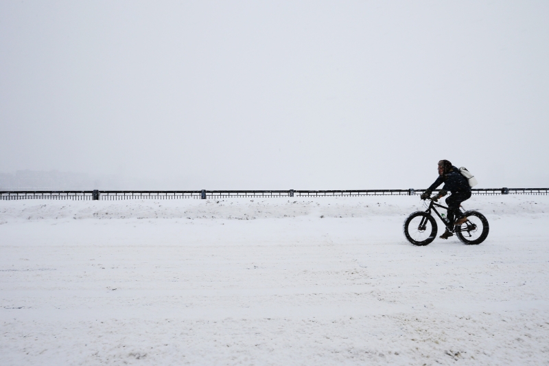 Uma forte nevasca atingiu o Nordeste dos Estados Unidos ontem, provocando o fechamento de escolas e aeroportos. Na imagem, um ciclista pedala por uma das principais avenidas de Boston, Massachusetts, totalmente coberta de neve.