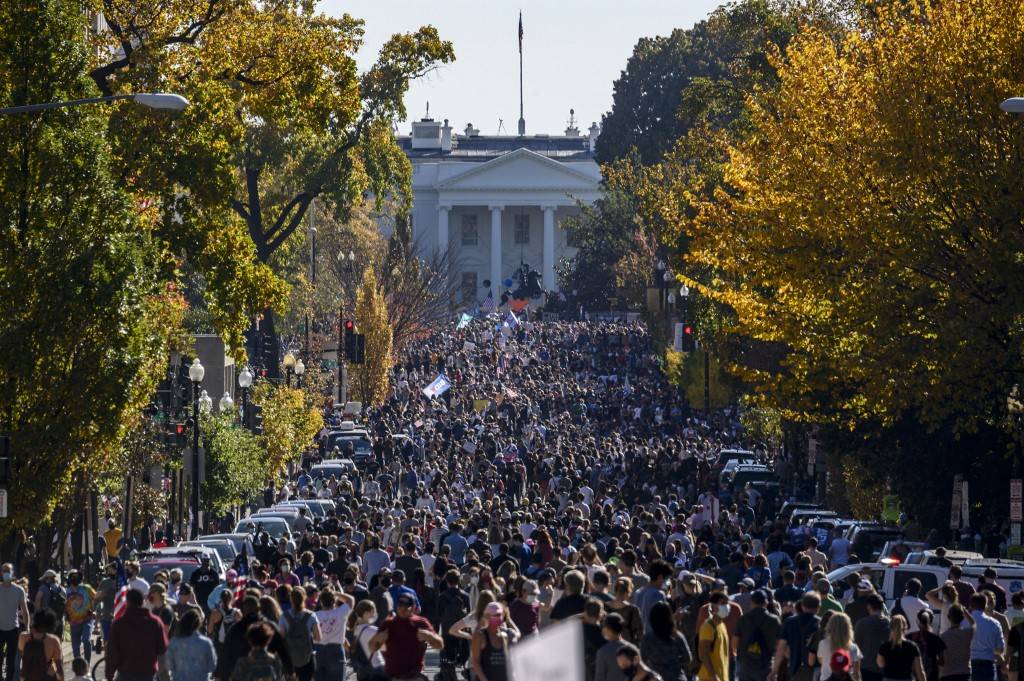 Em Washington, é imensa a multidão que se concentra em frente à Casa Branca, muitas delas cantam, dançam e portam bandeiras dos EUA. Não há conflitos entre eleitores de Biden e do presidente Donald Trump.