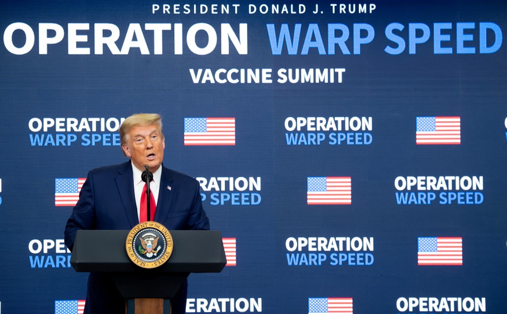 O presidente dos Estados Unidos, Donald Trump, disse nesta terça-feira (8) que o país está a dias da aprovação de uma vacina contra o novo coronavírus. A afirmação foi feita em discurso durante conferência da Operação Warp Speed. Segundo ele, a FDA, agência reguladora americana, deve aprovar o uso emergencial da vacina da Pfizer e BioNTech em alguns dias, acompanhada "pouco depois" pela liberação do imunizante desenvolvido pela Moderna.