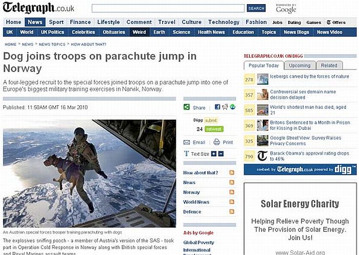 Um soldado que participou do salto contou ao jornal "Telegraph" que o cachorro estava mais tranquilo que muitos colegas recrutas.