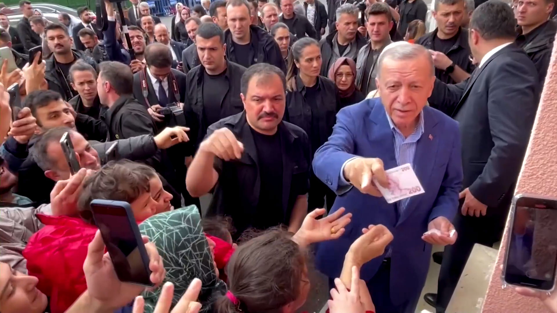O presidente e candidato à reeleição na Turquia, Recep Erdogan, distribuiu notas de dinheiro a apoiadores que aguardavam na fila para votar no segundo turno das eleições presidenciais neste domingo (28). Após cumprimentar as pessoas, Erdogan distribuiu a elas notas de 200 liras turcas, o equivalente a R$ 50.