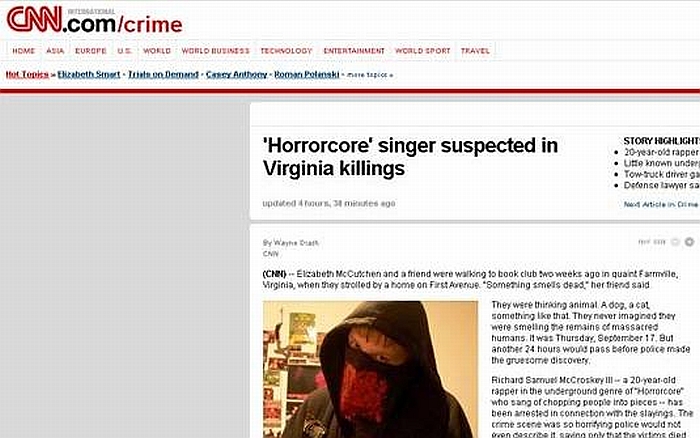 Um cantor do gênero musical "horrorcore", cujas letras falam em cortar pessoas em pedaços, foi preso nos Estados Unidos acusado de ligação com a morte de quatro pessoas no estado da Virgínia, segundo a rede de TV CNN.