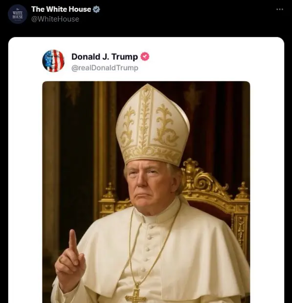 O presidente dos Estados Unidos, Donald Trump, publicou nesta sexta-feira (2) em seu perfil na Truth Social uma imagem criada por inteligência artificial em que ele aparece vestido como Papa. A reprodução foi republicada também pelo perfil oficial da Casa Branca no X (antigo Twitter).