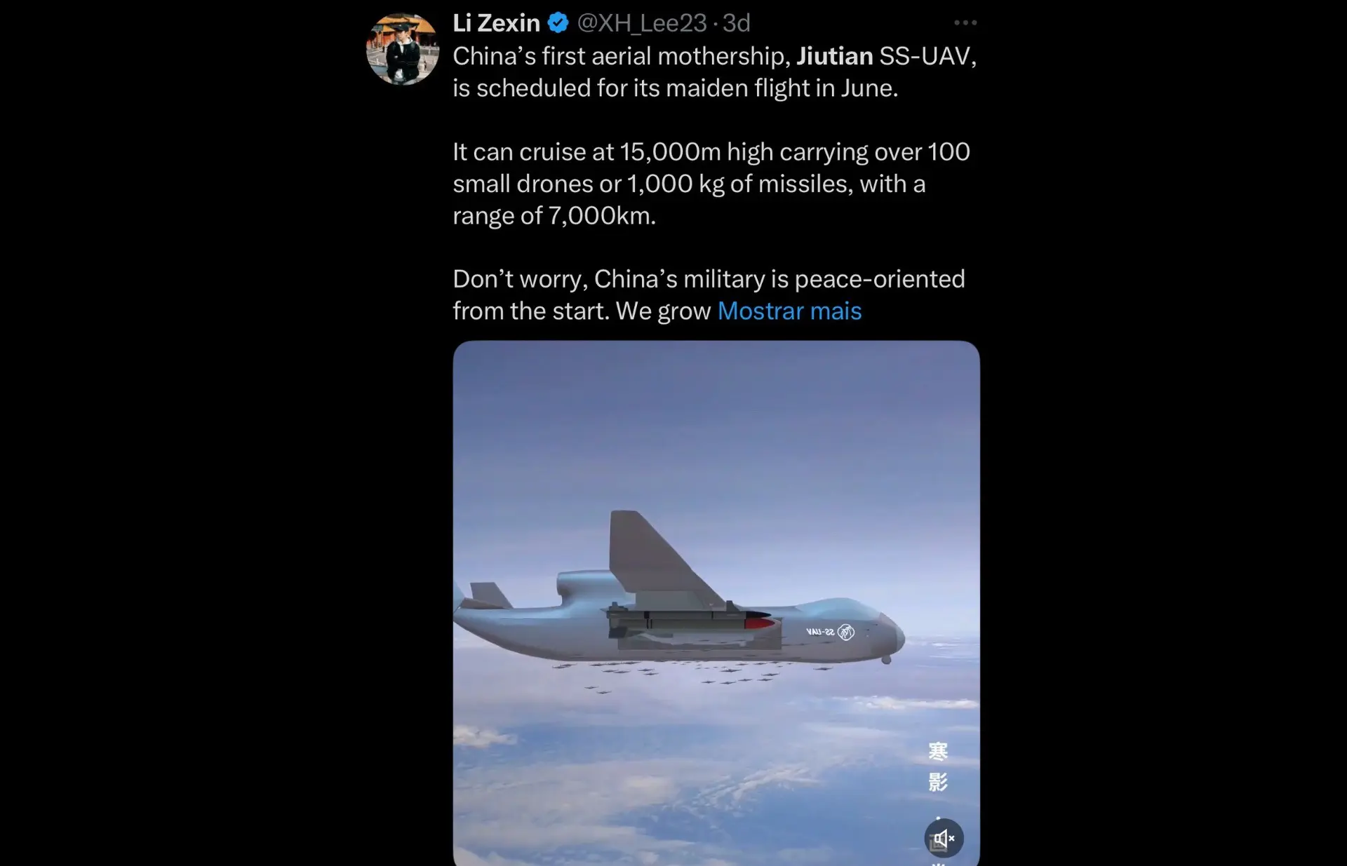 A propaganda do regime de Xi Jinping afirma que, quando estiver totalmente operacional, a "nave-mãe" lançará grandes enxames de drones para sobrecarregar os sistemas de defesa aérea de países inimigos.