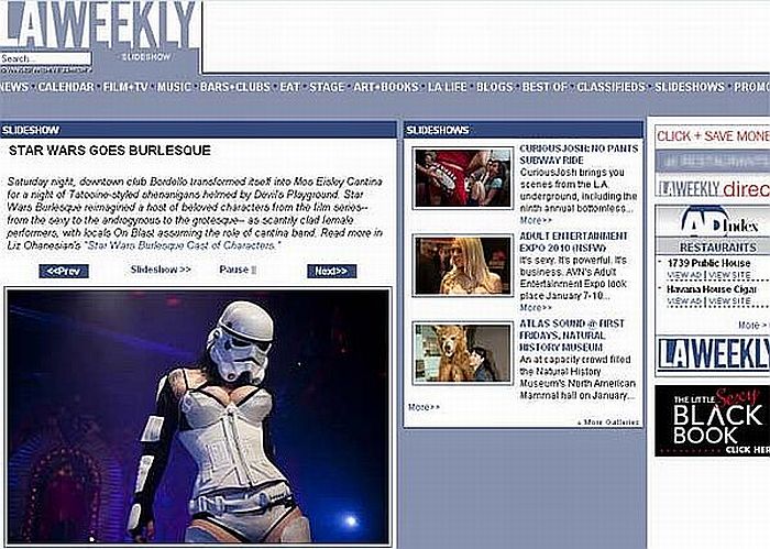 O clube Bordello, em Los Angeles, na Califórnia (EUA), transformou-se no último no sábado na cantina Mos Eisley, bar da saga "Star Wars", e apresentou um striptease no qual as dançarinas usavam roupas dos personagens da série, como os soldados do império, Darth Vader, C-3PO e a Princesa Leia, segundo a reportagem da revista "LA Weekly".