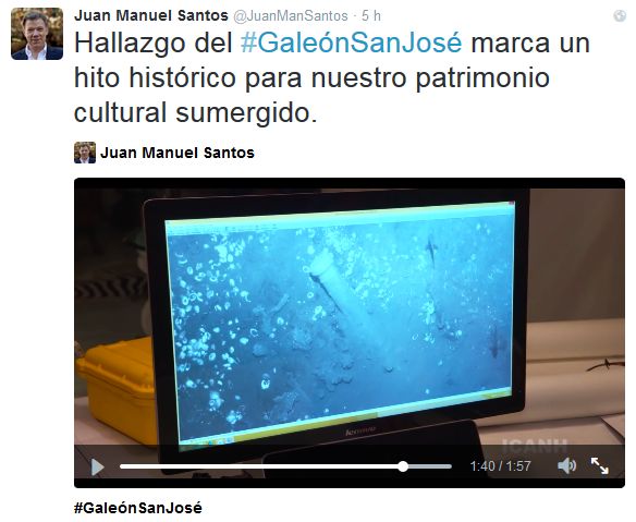 O presidente da Colômbia, Juan Manuel Santos, divulgou em seu perfil no Twitter a descoberta do galeão espanhol San Jose, naufragado com uma carga de ouro e pedras preciosas há mais de 300 anos.