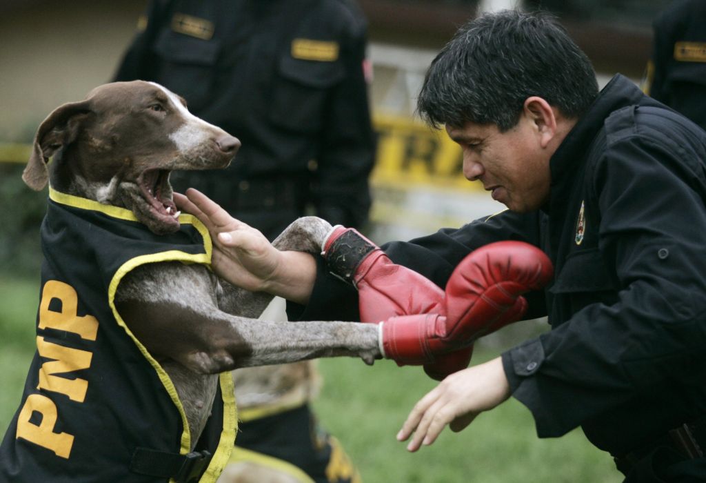 Vestindo luvas de boxe vermelhas, a cadela Chela enfrenta seu treinador em Lima, no Peru, como se fosse um verdadeiro lutador. Ela executa os golpes enquanto se equilibra sobre as patas traseiras. Da raça braco alemão de pêlo curto, Chela tem três anos e meio. Segundo seu treinador, esse é o único cão do Peru - se não for do mundo - que sabe lutar boxe.