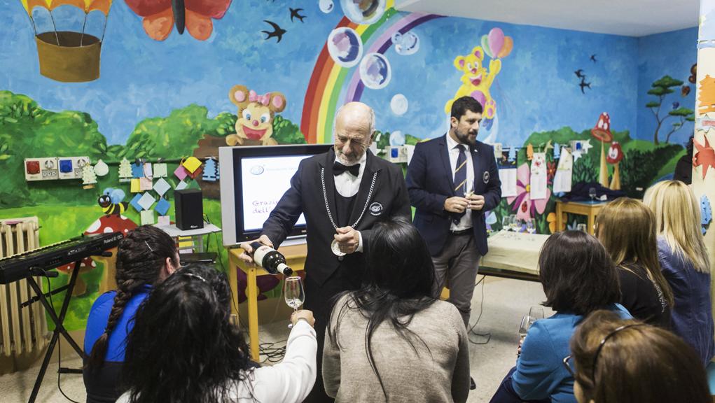 Roberto Giannone, que trabalha para a associação local de sommeliers, demonstrou então como abrir uma garrafa, eliminando o invólucro que cobre o gargalo com três cortes, inserindo o saca-rolha e, suavemente, retirando a rolha.