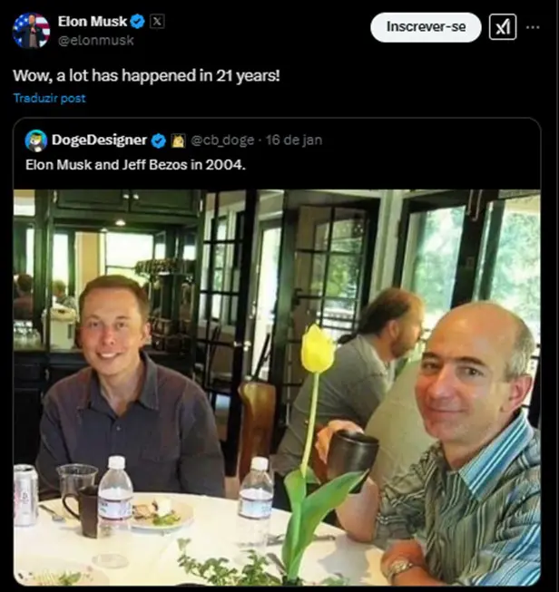 O gesto inesperado levou à viralização de uma foto antiga dos dois bilionários juntos, tirada em um jantar de 2004. Musk compartilhou a imagem em sua rede social com o comentário.
