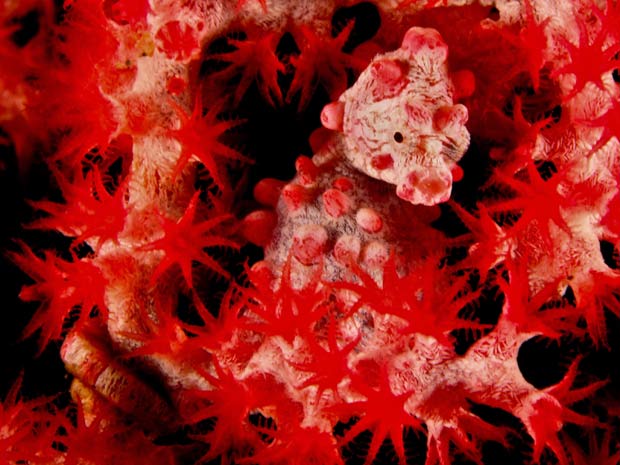Uma das vencedoras foi uma foto feita pelo britânico Michael Gallagher que mostra um cavalo-marinho vermelho, que se camufla facilmente entre uma rede de corais e consegue se livrar dos predadores.