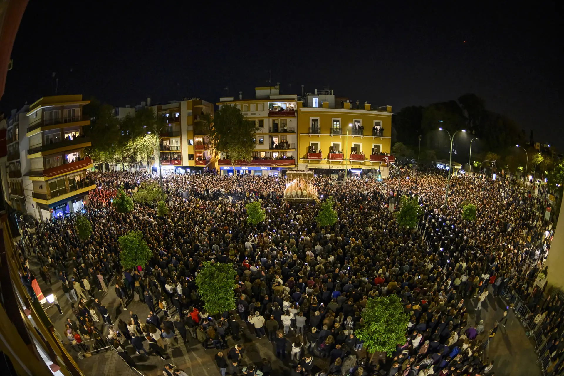 Procissão da Virgem da Esperança de Macarena, em Sevilha, na noite de quinta-feira (17) (Foto: EFE/ Raúl Caro)