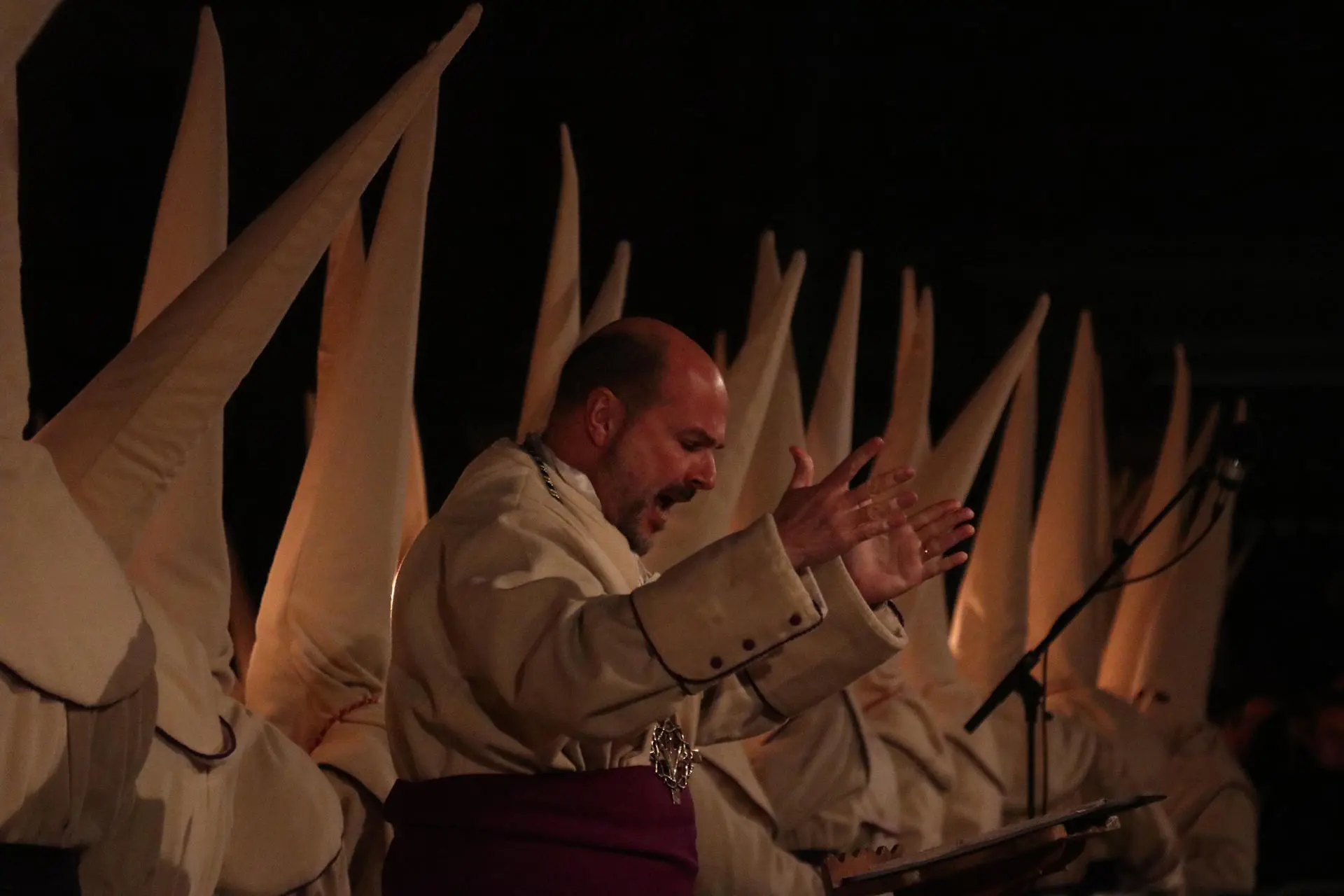 Canto do Miserere durante o desfile da Irmandade Penitencial de Jesus Yacente, em Zamora, na Espanha. O desfile da Irmandade termina depois de uma hora da manhã da noite de Quinta-feira para Sexta-feira Santa (Foto: EFE/Mariam A. Montesinos)