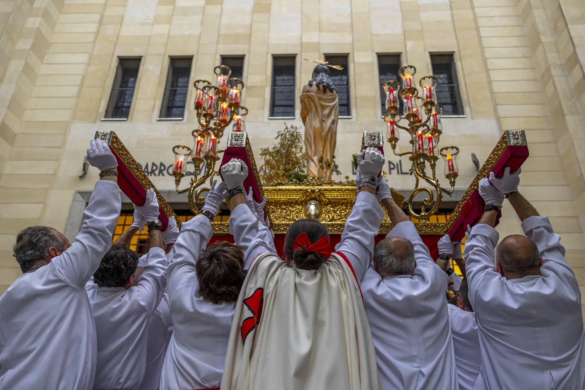 Imagem da Virgem da Esperança de Macarena saindo da Basílica para a procissão em Sevilha, Espanha, na noite de quinta-feira (17) (Foto: EFE/Raúl Caro)