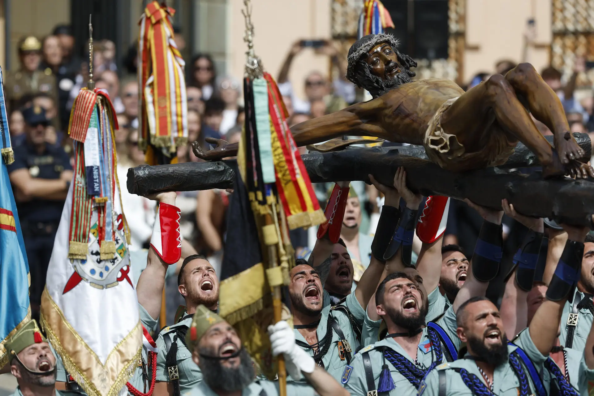 Legionários carregam o Cristo da Boa Morte, da Irmandade de Mena, pelas ruas de Málaga, Espanha, nesta Quinta-feira Santa, em um dos eventos mais populares da Semana Santa andaluza, que reúne milhares de pessoas (Foto: EFE/ Jorge Zapata)