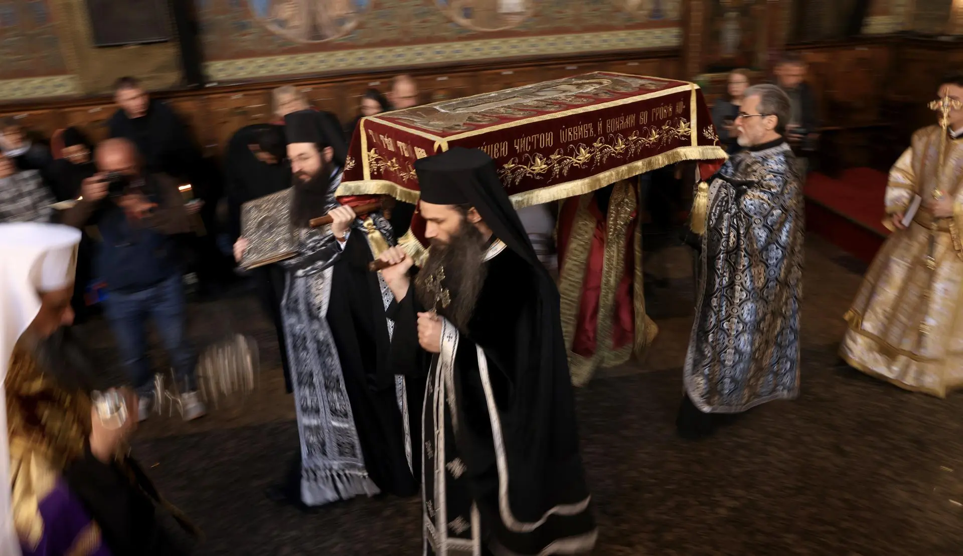 Sacerdotes ortodoxos carregam uma réplica do sudário de Cristo durante uma missa de Sexta-feira Santa na igreja Sveta Nedely em Sofia, Bulgária (Foto: EFE/EPA/VASSIL DONEV)