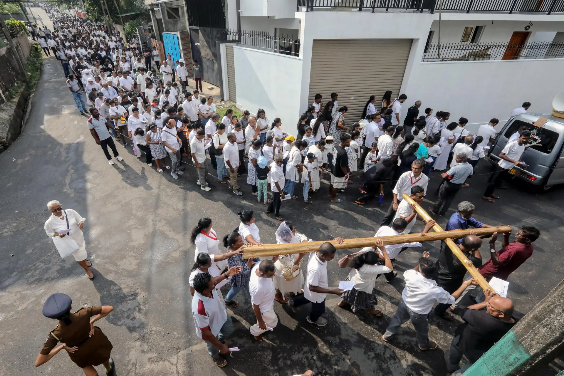 Fiéis católicos do Sri Lanka carregam cruz durante a procissão da Sexta-Feira Santa, em uma igreja em Colombo (Foto: EFE/EPA/CHAMILA KARUNARATHNE)
