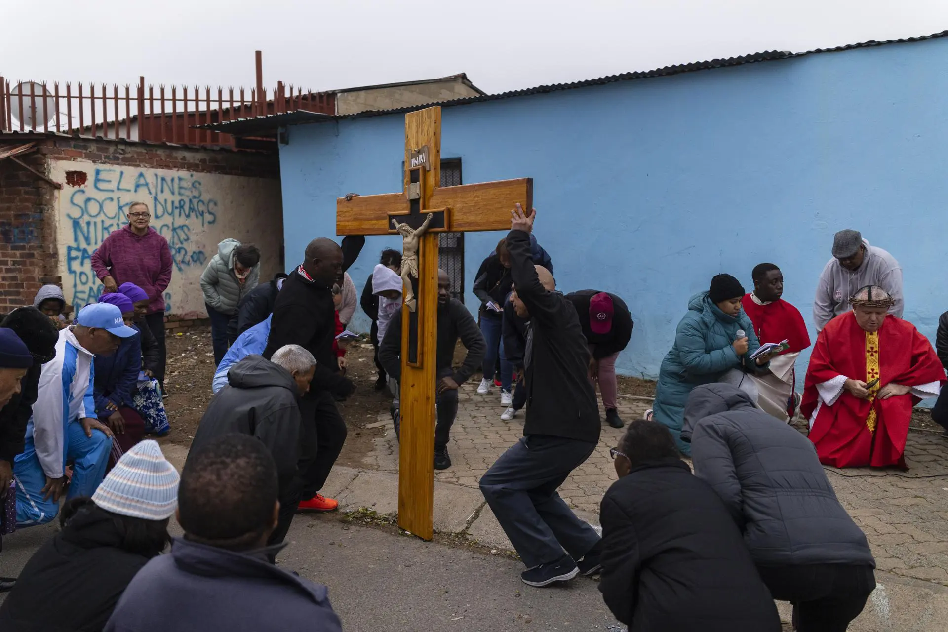Membros da congregação da Igreja de São Francisco Xavier Martindale, em Joanesburgo, África do Sul. O padre PJ Cassidy e sua congregação caminharam pelas ruas de Westburg na Sexta-feira Santa, orando pela paz e compartilhando a palavra de Deus em um subúrbio dominado pelas drogas, violência e pobreza. (Foto: EFE/EPA/KIM LUDBROOK)