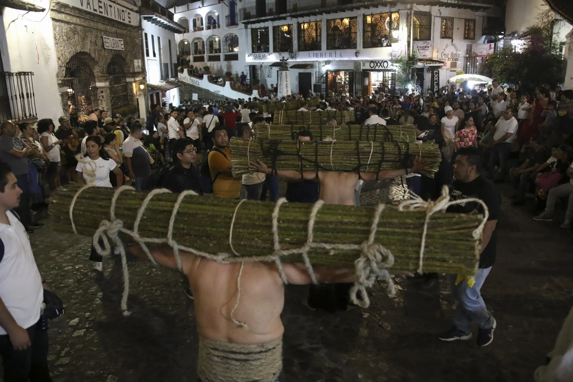 Fiéis católicos participam na Quinta-feira Santa da 'Procissão dos Cristos'. Em silêncio, descalços, com capuz no rosto e saia preta como forma de penitência, carregam nas costas um rolo de palitos de amora pesando aproximadamente 50 quilos, na cidade de Taxco (Foto: EFE/José Luis de la Cruz)