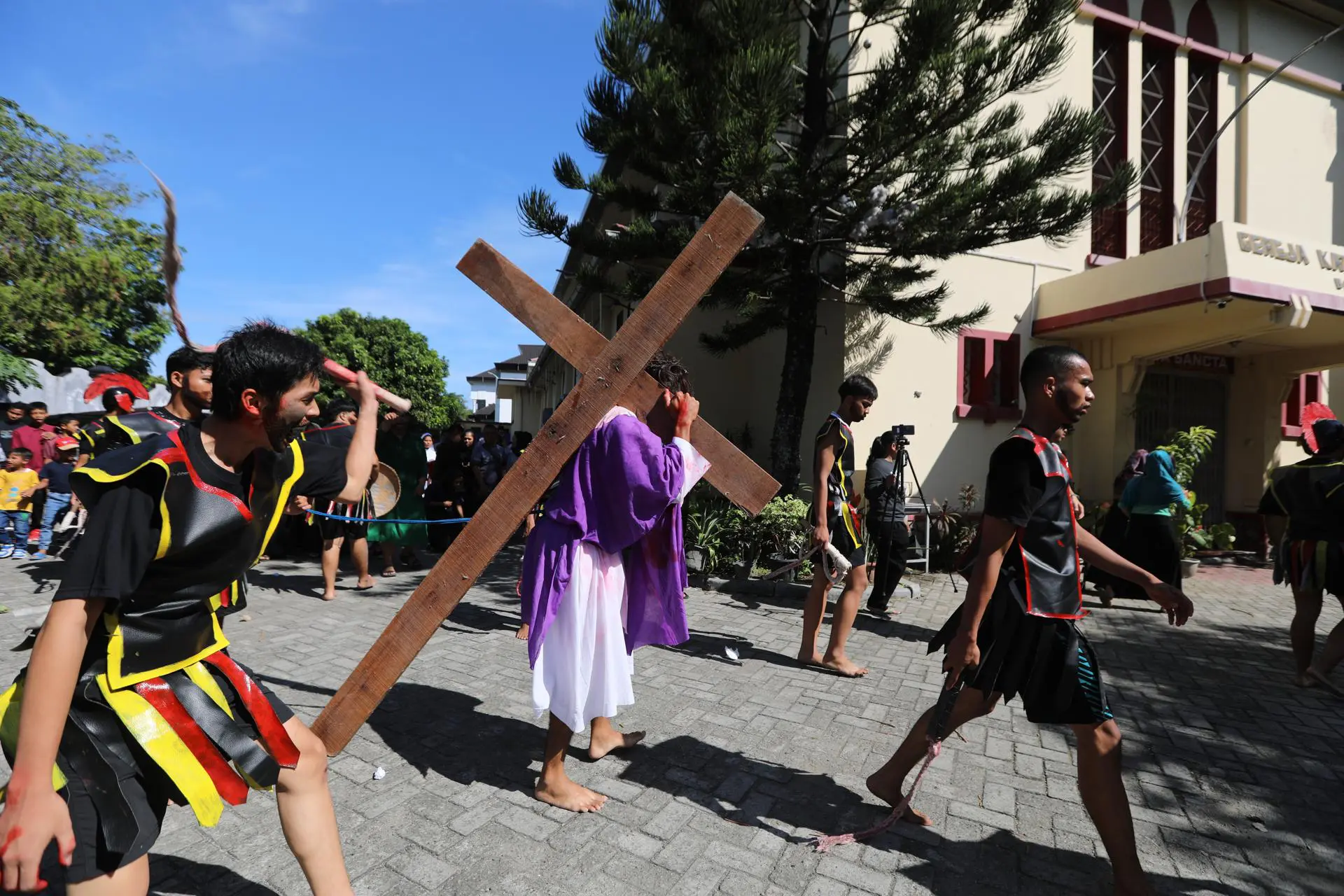 Encenação da 'Via Dolorosa' na Sexta-feira Santa na Igreja Católica Hati Kudus, em Banda Aceh, Indonésia (Foto: EFE/EPA/HOTLI SIMANJUNTAK)