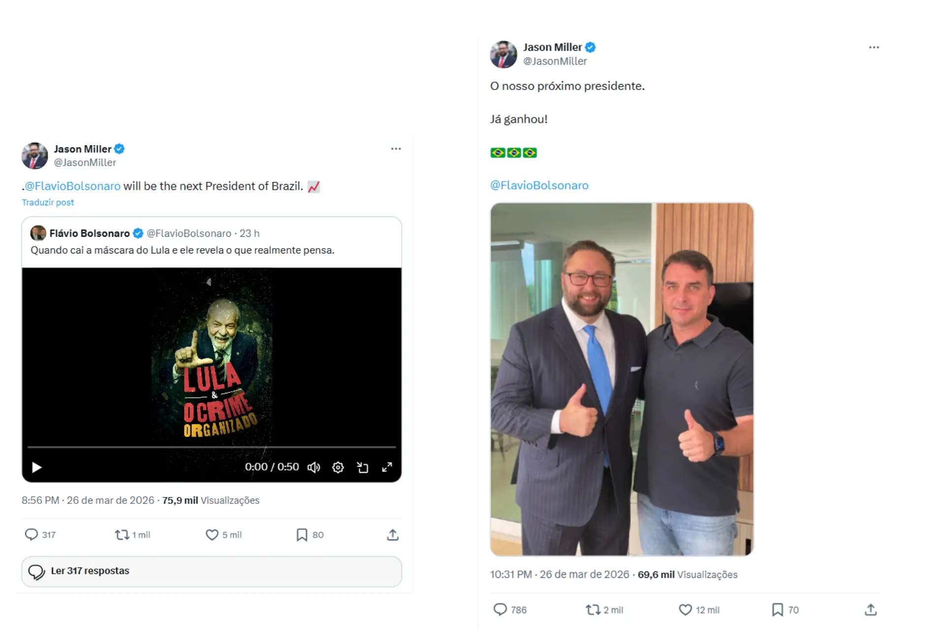 Em outra publicação, ele aparece em uma foto ao lado do pré-candidato, filho do ex-presidente Jair Bolsonaro, outro aliado do governo Trump, e sugere que o possível representante da direita nas eleições presidenciais já teria ganhado.
