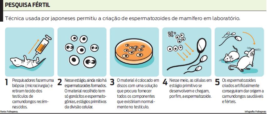 Os espermatozoides, criados por pesquisadores japoneses da Universidade da Cidade de Yokohama, conseguiram dar origem por meio de fertilização in vitro a descendentes, machos e fêmeas, saudáveis e férteis.