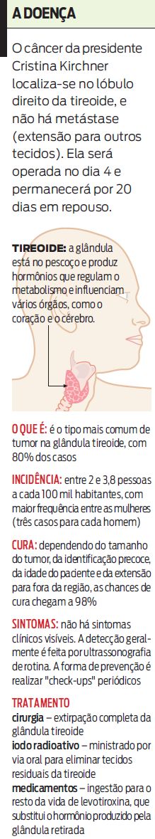 A presidente da Argentina, Cristina Kirchner, fez ontem a sua primeira aparição em público após a notícia sobre a sua cirurgia, no próximo dia 4, em consequência de um câncer na glândula tireoide. Bem-humorada e sorridente, Cristina manteve o tom usual de seus discursos, agradeceu "todas as mostras de solidariedade e de apoio", mas não fez referências diretas ao câncer.