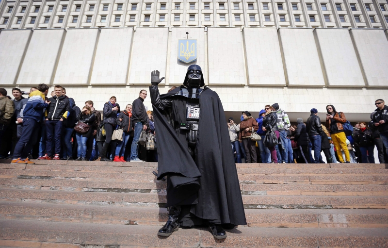 O líder do Partido da Internet, vestido de Darth Vader, o vilão da cinessérie Guerra nas Estrelas (1977), participa de uma manifestação diante da Comissão Eleitoral Ucraniana, em Kiev. Numa espécie de protesto bem-humorado, "Darth Vader" deu entrada nos documentos para concorrer à próxima eleição presidencial da Ucrânia.