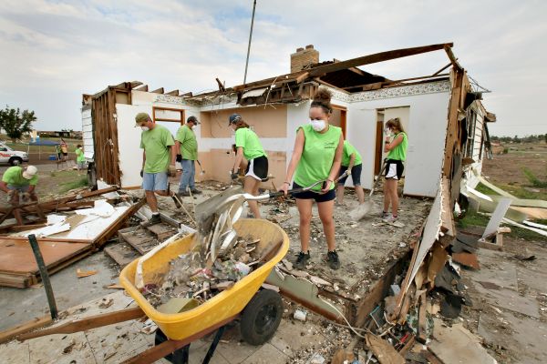 Voluntários ajudam na limpeza de local atingido por tornado em Joplin, Missouri, nos Estados Unidos. A região ainda está se recuperando de um forte tornado que a deixou devastada em maio deste ano. Na ocasião, 7,5 mil casas e 500 empresas ficaram destruídas. O total de mortos chegou a 160.