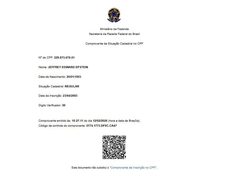 A Gazeta do Povo entrou em contato com a Receita Federal para comentar a existência do CPF em nome de Epstein, mas o órgão não se manifestou até a publicação desta matéria. O texto será atualizado quando houver resposta.