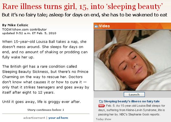 Com uma enfermidade muito incomum, chamada Síndrome de Kleine-Levin ou mal da Bela Adormecida, a britânica Louisa Ball, de 15 anos de idade, tornou-se um desafio para os médicos. Após períodos de absoluta normalidade que podem chegar a um ano, ela dorme durante dias já passou duas semanas adormecida. Seus pais precisam acordá-la, à base de chacoalhões e cutucões, para que ela vá ao banheiro ou se alimente. Louisa até levanta, mas completamente desorientada, muito longe de estar 100% alerta.