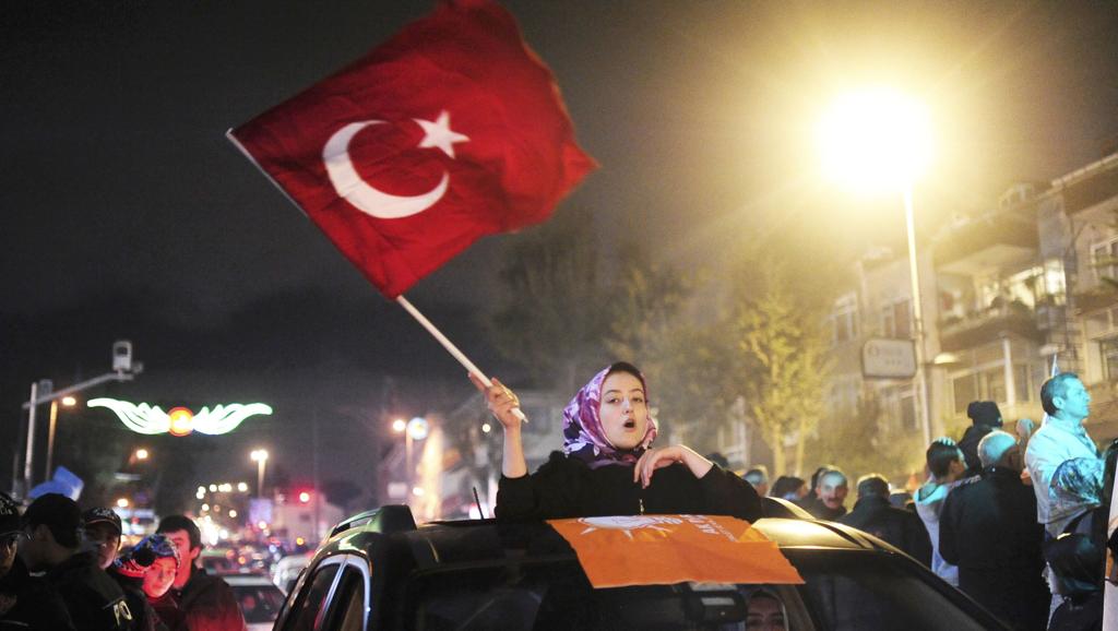 As eleições parlamentares da Turquia neste domingo (1.º) asseguraram ao governista Partido Justiça e Desenvolvimento (AKP) uma significativa vitória. O partido retoma o governo de partido único cinco meses depois de perder a maioria absoluta. O primeiro-ministro Ahmet Davutoglu declarou a vitória enquanto os resultados das urnas divulgados pela tevê estatal mostram que o partido obteve mais de 49% dos votos. Com quase 99% das urnas apuradas, o AKP teve votos suficientes para conseguir 316 assentos no parlamento, o que lhe confere confortável maioria no parlamento de 550 assentos.