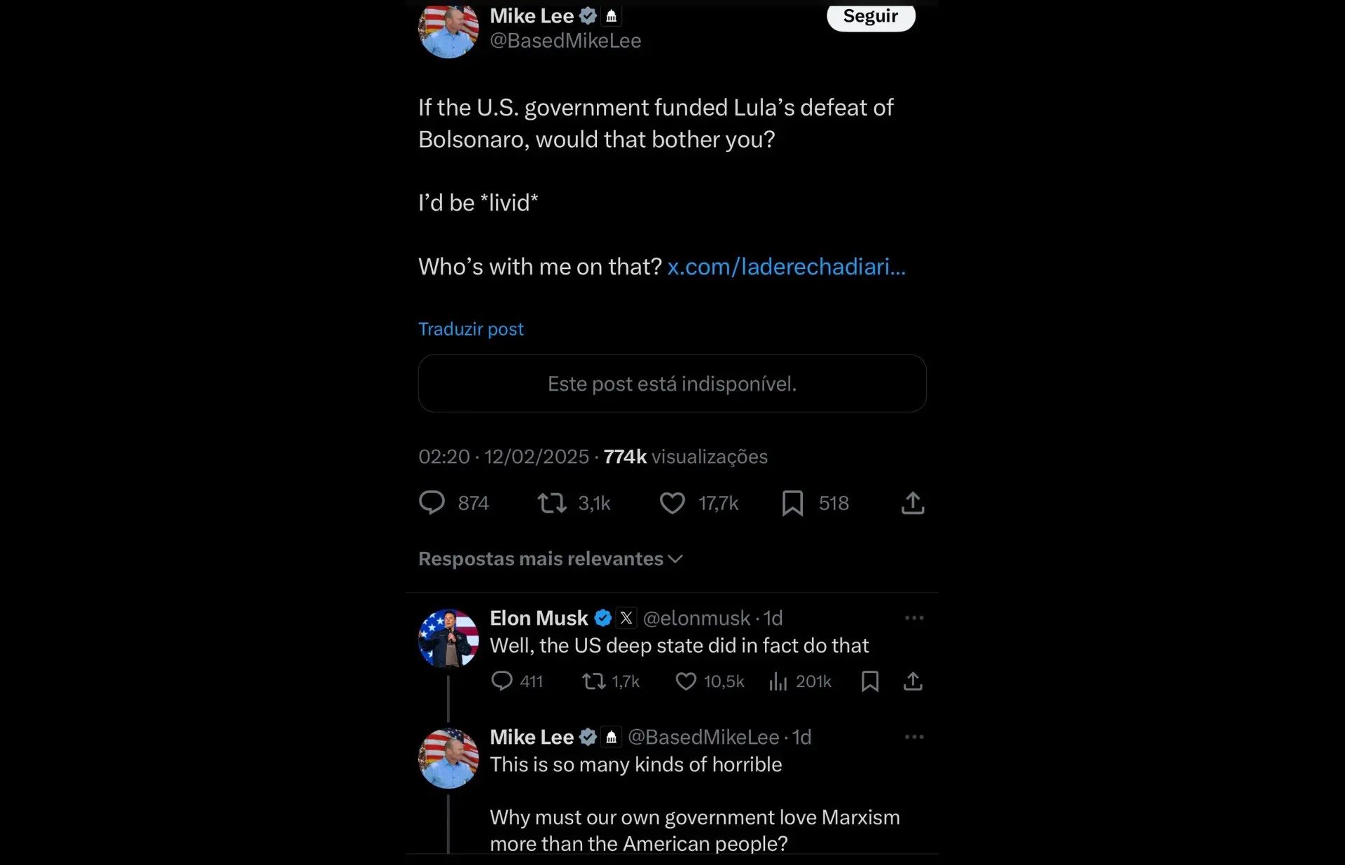 “Se o governo dos EUA financiasse a derrota de Bolsonaro por Lula, isso o incomodaria? Eu ficaria lívido. Quem está comigo nisso?”, publicou o político do Partido Republicano no X. Em resposta, Musk escreveu: “Bem, o estado profundo dos EUA de fato fez isso".