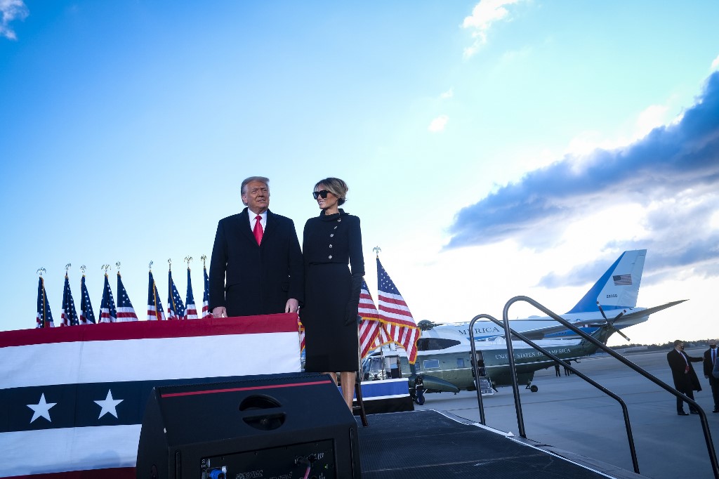 O mandatário embarcou no helicóptero presidencial ao lado de sua mulher, Melania Trump, em direção à Base Aérea Andrews, onde participou de evento com apoiadores. "Foi a maior honra da minha vida governar o país. Eu amo o povo americano", disse a repórteres ao partir. O presidente em fim de mandato quebrará a tradição de não participar da cerimônia de posse do sucessor. O vice-presidente Mike Pence deve comparecer.